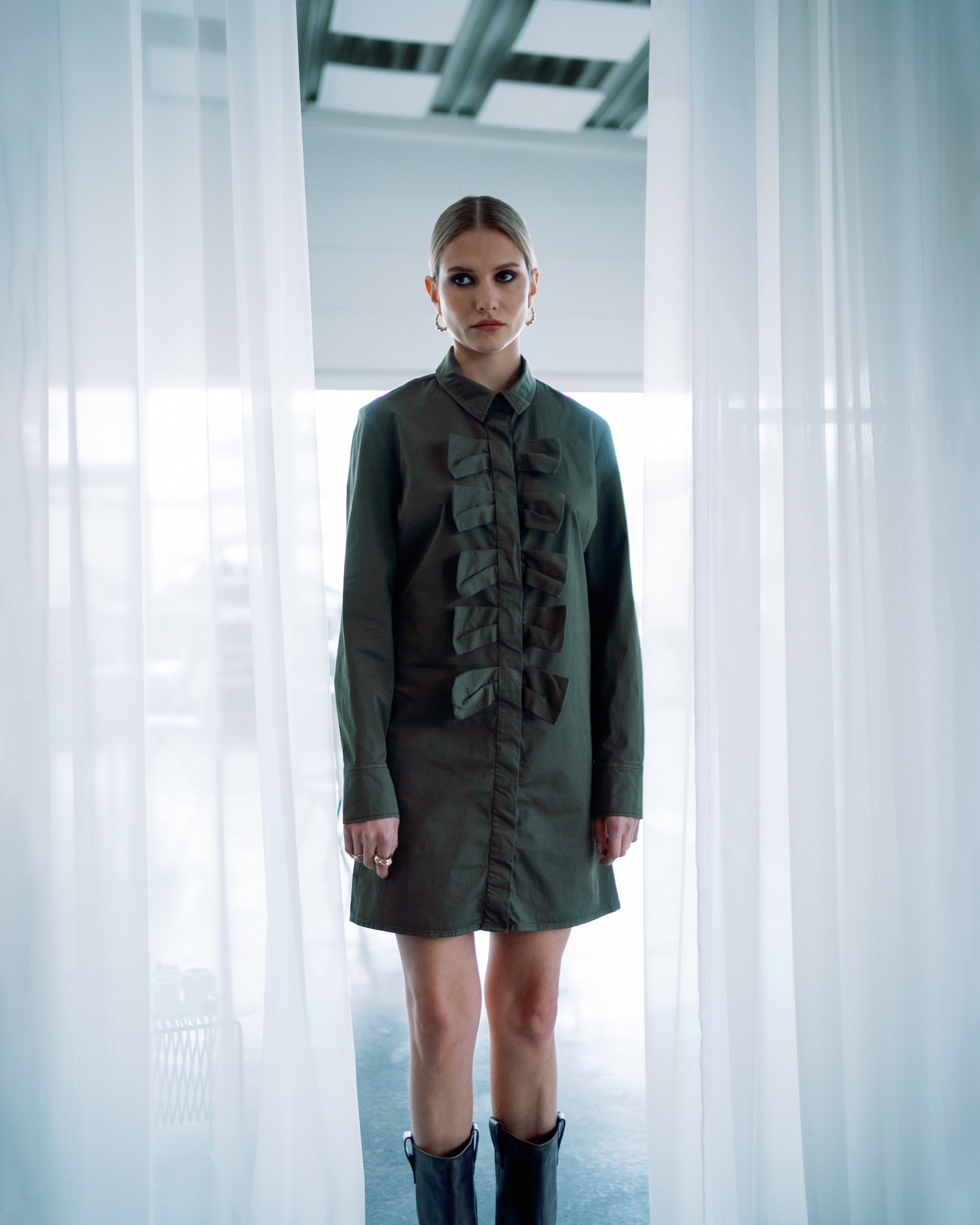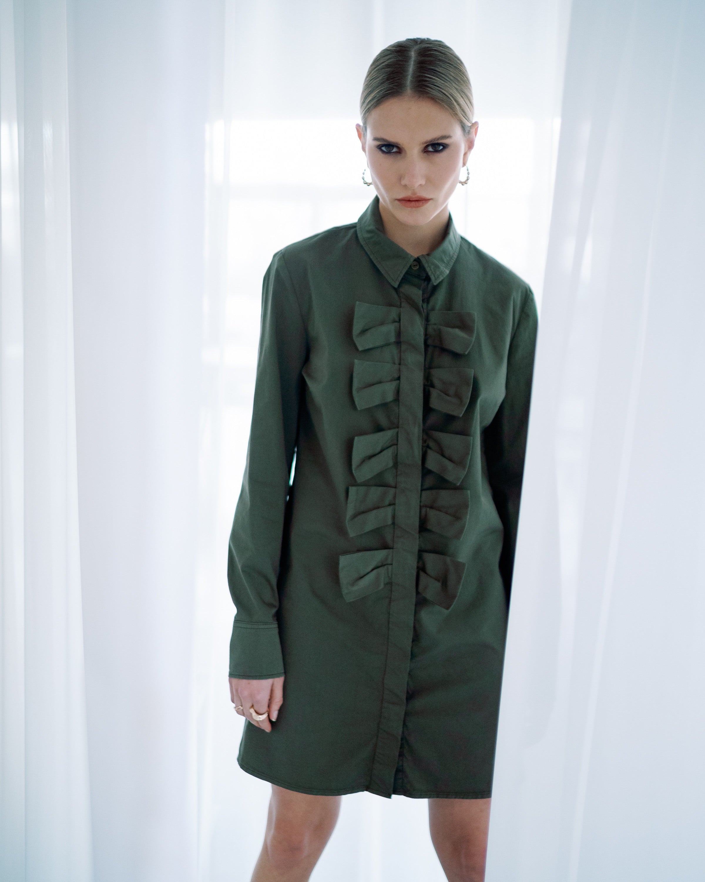 The Grenache Cotton Dress in dark olive is stylish and comfortable. Made from cotton, it has a clean collar, long sleeves, and a short length. Bold bow details on the front give it a modern, elegant touch. Wear with boots for a cool look or heels for a chic finish.