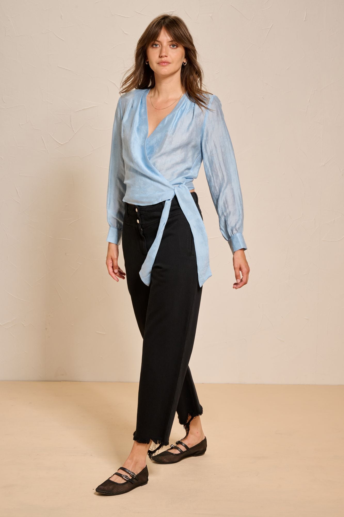 This refined gracio wrap blouse embodies effortless elegance and modern sophistication. Designed with a flattering wrap silhouette and a deep V-neckline, it beautifully enhances the figure while the delicate tie detail at the waist adds a touch of understated luxury. Crafted from a lightweight, fluid fabric with a light woven butterfly print, the blouse drapes gracefully and offers a subtle sheer finish for an elevated look.