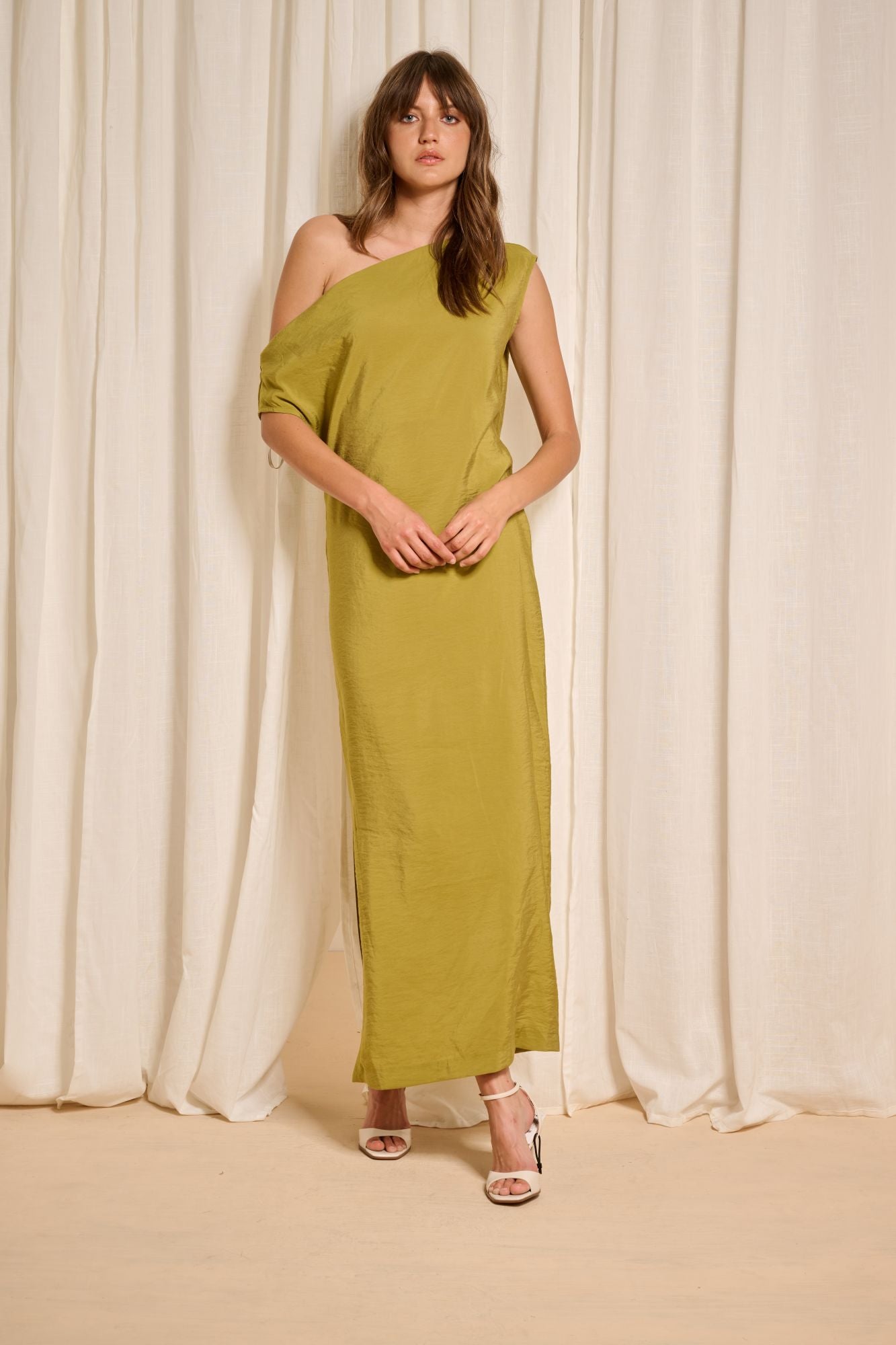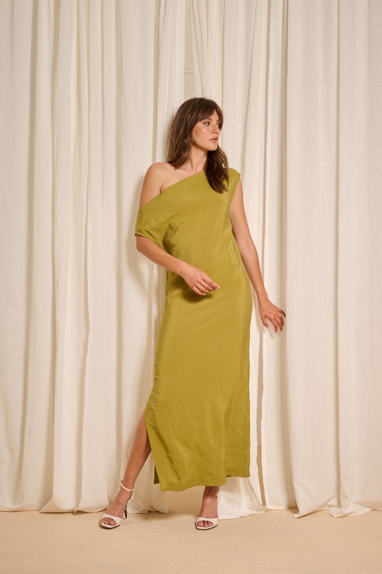 The Mastella one-shoulder dress is crafted from sumptuously soft modal fabric that drapes beautifully over the body. A subtle side slit adds sensuality, while the matching belt defines the waist for a flattering silhouette.