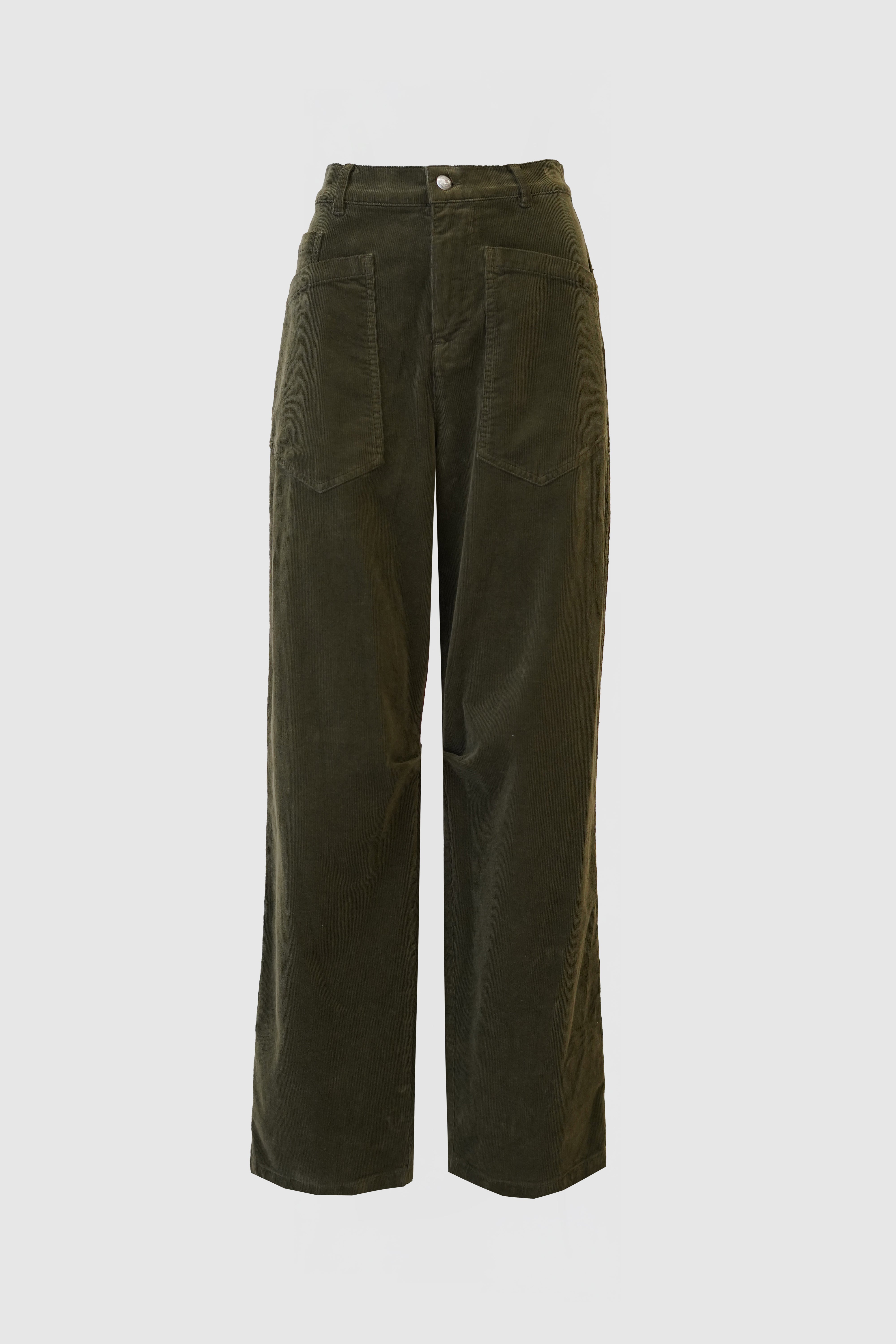 The Malbec Rib Velvet Pants in dark olive combine comfort and style. Made from soft ribbed velvet, they feature a high waist, wide-leg fit, and front patch pockets. Easy to dress up or down, wear them with a blouse for a chic look or pair with the matching jacket for a bold outfit.