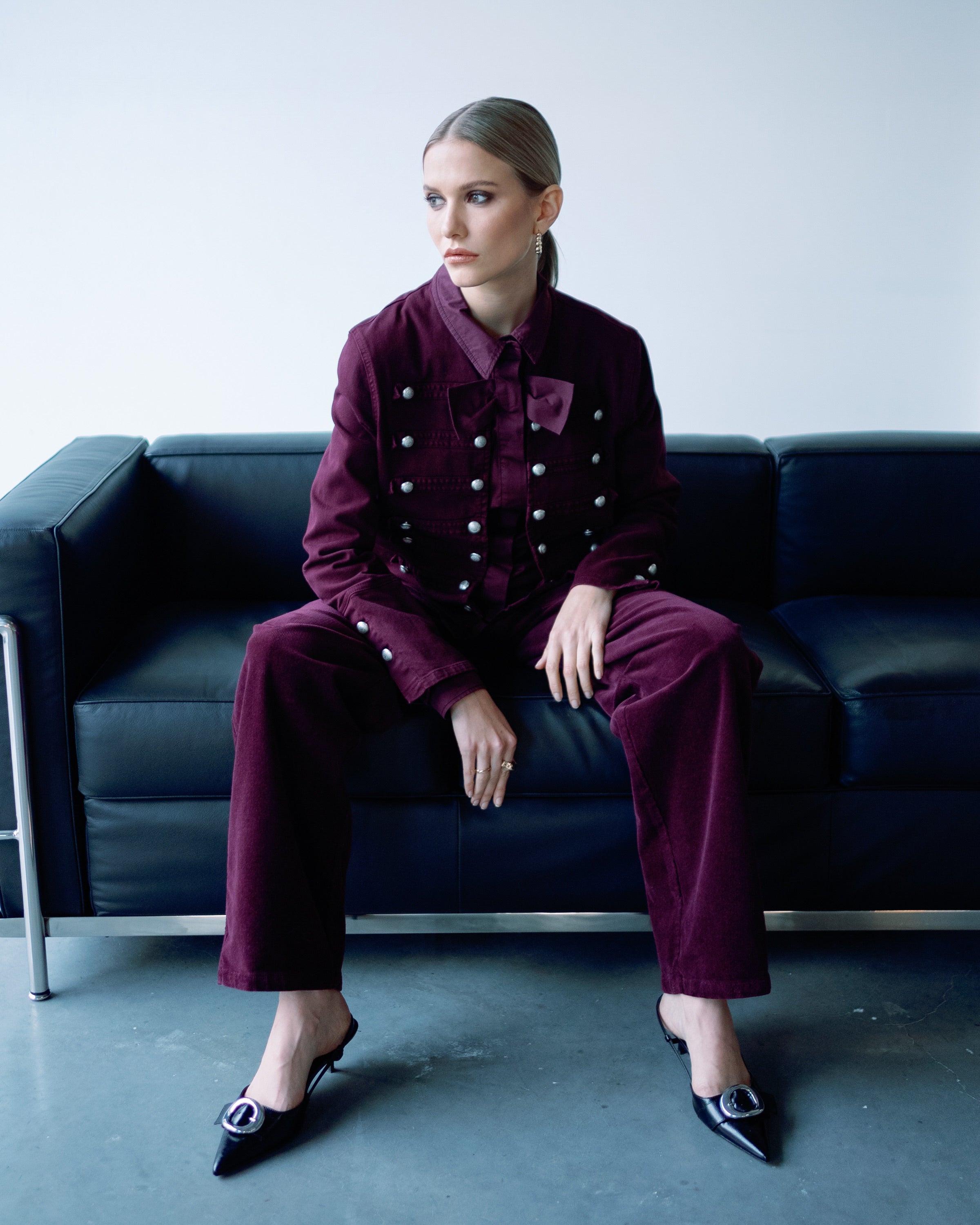 The Chenin Jeans Jacket in deep wine is a standout piece with stylish details. It features silver buttons throughout, a bow detail under the collar, and button accents at the cuffs. Pair it with the matching Malbec Rib Velvet Pants for a suit-inspired look, or mix with jeans or skirts for a chic twist.